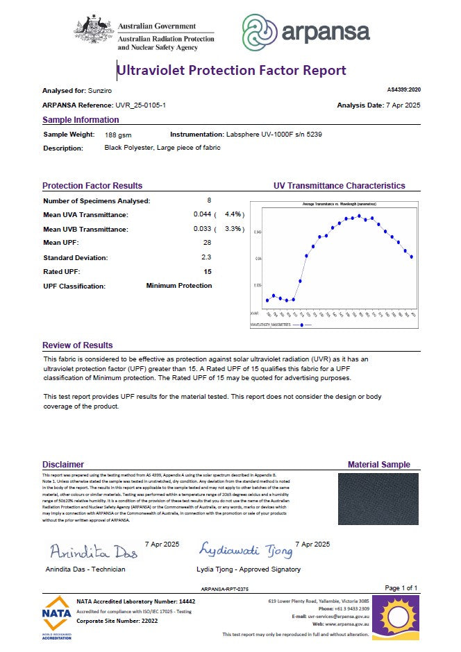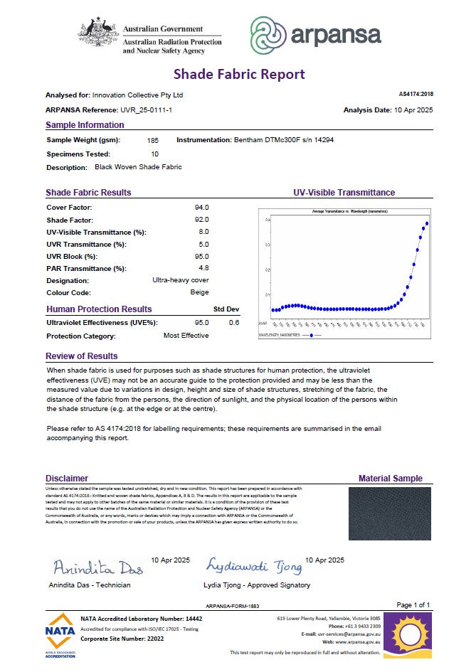 Our shades will block up to 95% of harmful UV (UPF 15+), as tested by Australian Radiation Protection and Nuclear Safety Agency (ARPANSA).